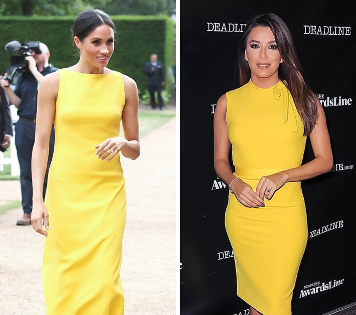 This classic straight dress silhouette is featured by nearly every brand, but prices can vary widely. Meghan Markle and Eva Longoria’s outfits are perfect examples of this. The left picture shows a stunning dress by Brandon Maxwell, while the right features an outfit from Zara.