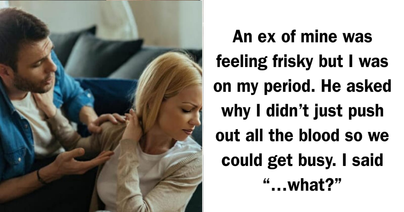An ex of mine was feeling frisky, but I told him I was on my period. His brilliant solution? “Why don’t you just push out all the blood so we can get busy?”